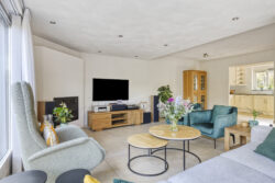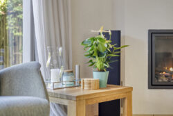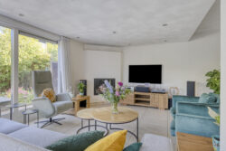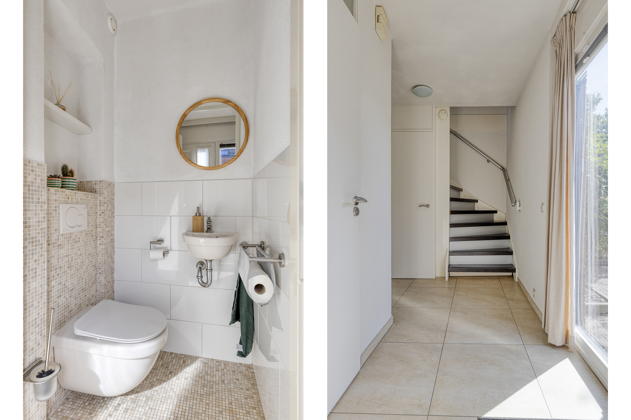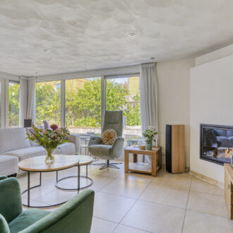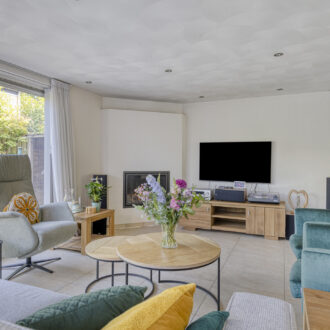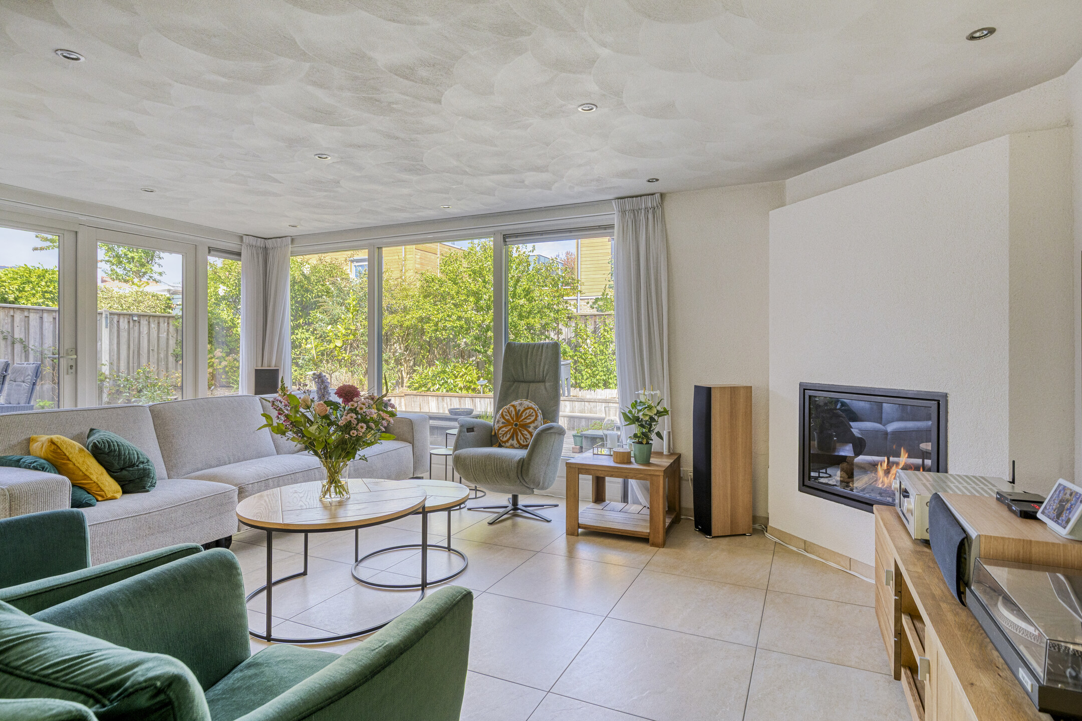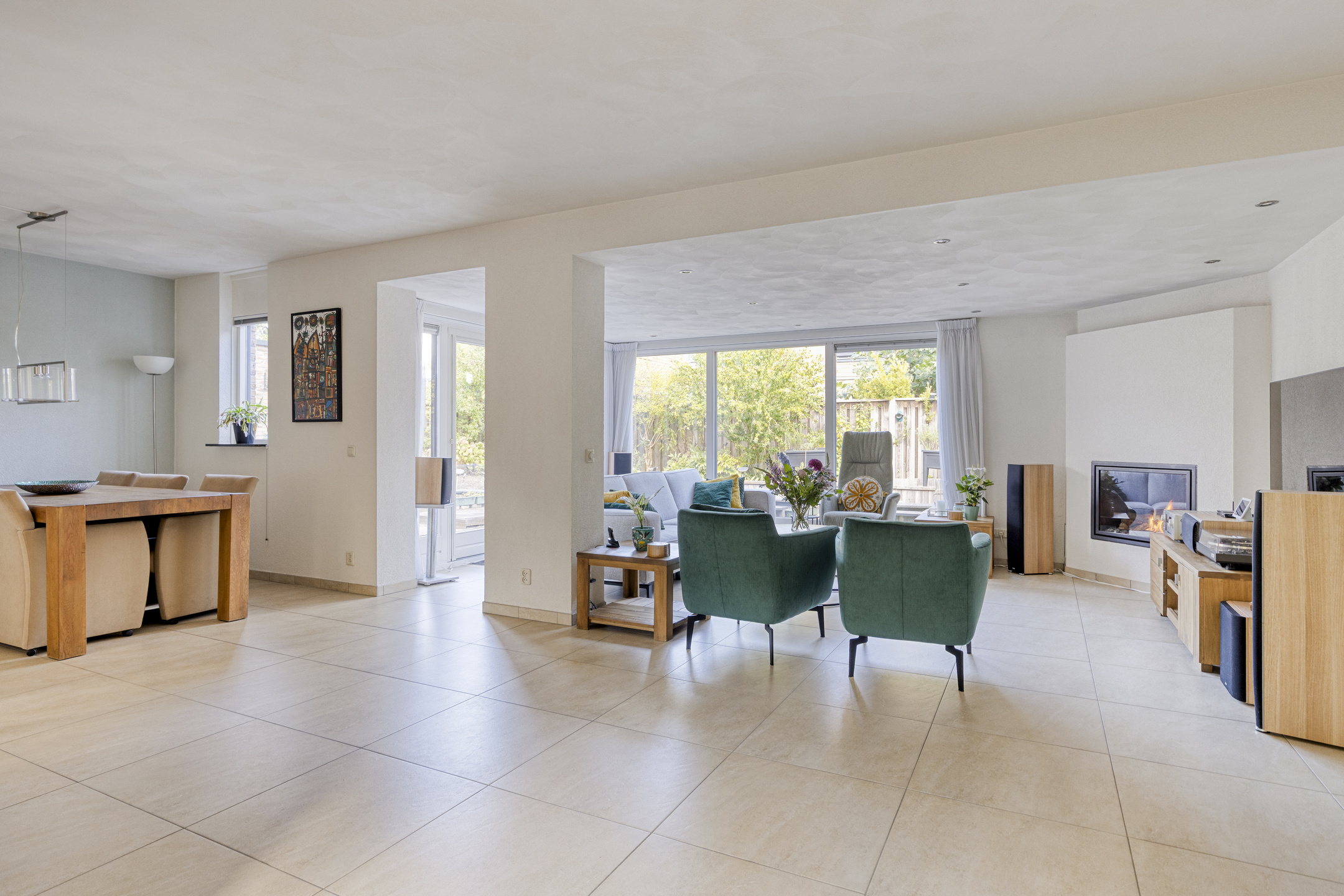 Begane grond: Ruime entree met hal, toilet (hangcloset) met fontein en meterkast. Vanuit de hal bereik je de royale, uitgebouwde woonkamer, waar de grote ramen zorgen voor een prachtige lichtinval. De gezellige gashaard vormt het warme middelpunt van de ruimte, terwijl de dubbele openslaande deuren toegang geven tot de achtertuin.