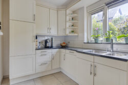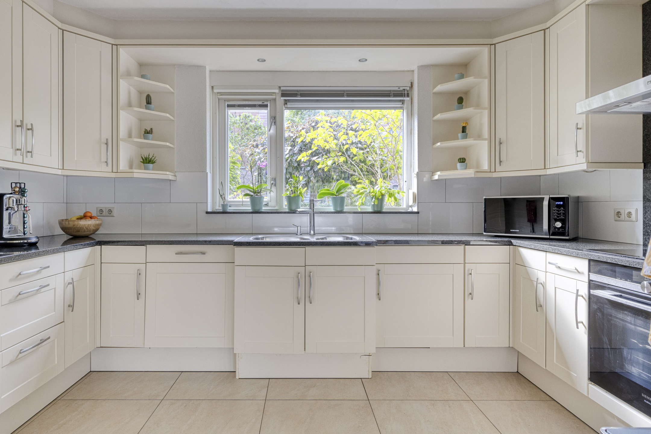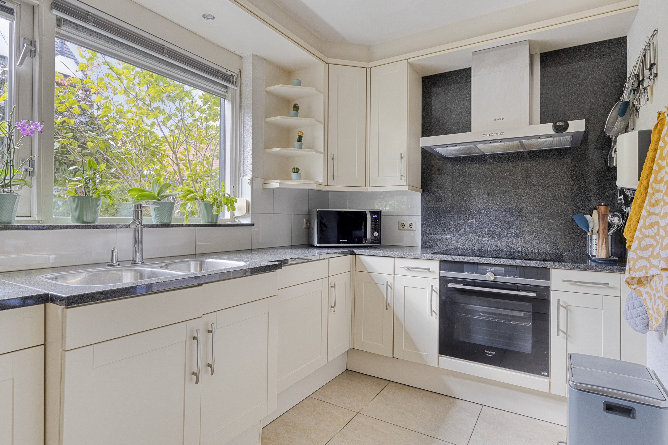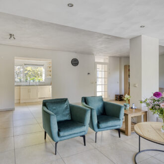 Aan de voorzijde bevindt zich de halfopen keuken in landelijke stijl, uitgerust met granieten werkblad en diverse inbouwapparatuur zoals een koelvriescombinatie, vaatwasser, inductiekookplaat en stoomoven (beide van Siemens). De gehele begane grond is afgewerkt met een plavuizenvloer met comfortabele vloerverwarming, wat zorgt voor een behaaglijk binnenklimaat.