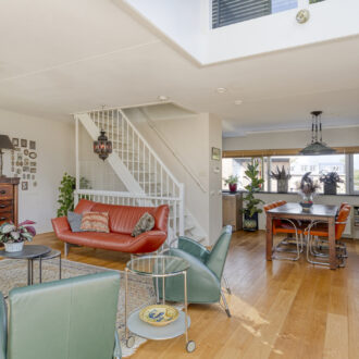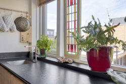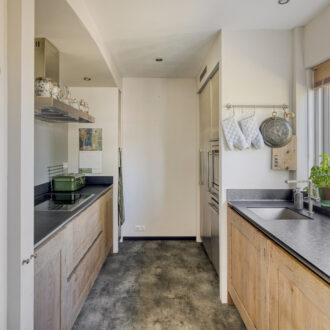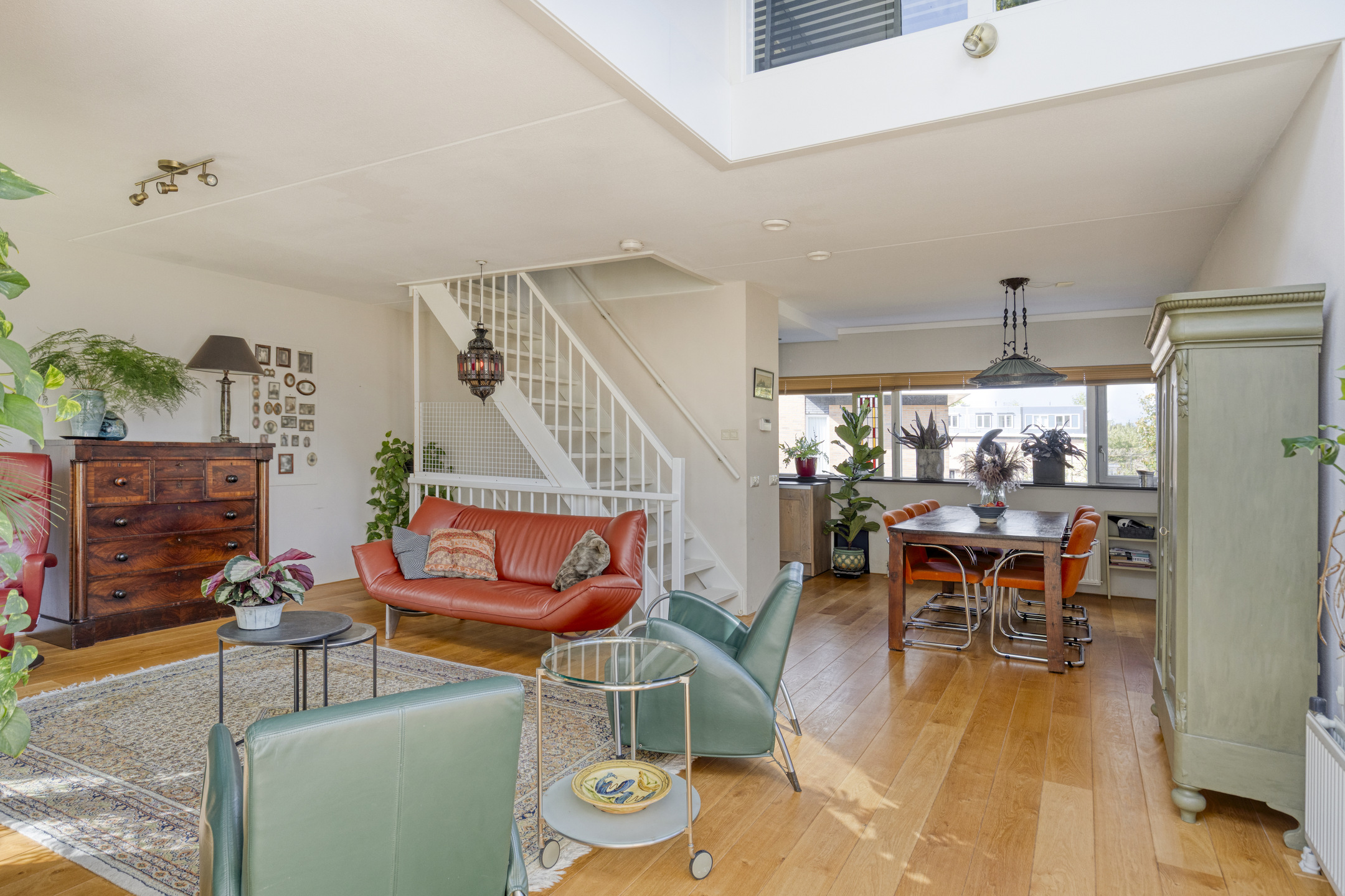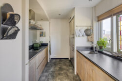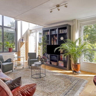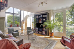 Een prachtige, lichte woonkamer van ca. 40 m² met veel sfeer en ruimtelijkheid dankzij de vide en de grote lichtstraat aan de zijkant van de woning. Vanuit de woonkamer is er toegang tot een royaal balkon (ca. 9 m²) op het zuidoosten, voorzien van elektrisch zonnescherm. De halfopen keuken is gemoderniseerd en uitgerust met diverse inbouwapparatuur en biedt mooi uitzicht over het voorgelegen grasveld met speeltoestellen voor kinderen. Vrijwel de gehele verdieping is afgewerkt met een fraaie massieve parketvloer.