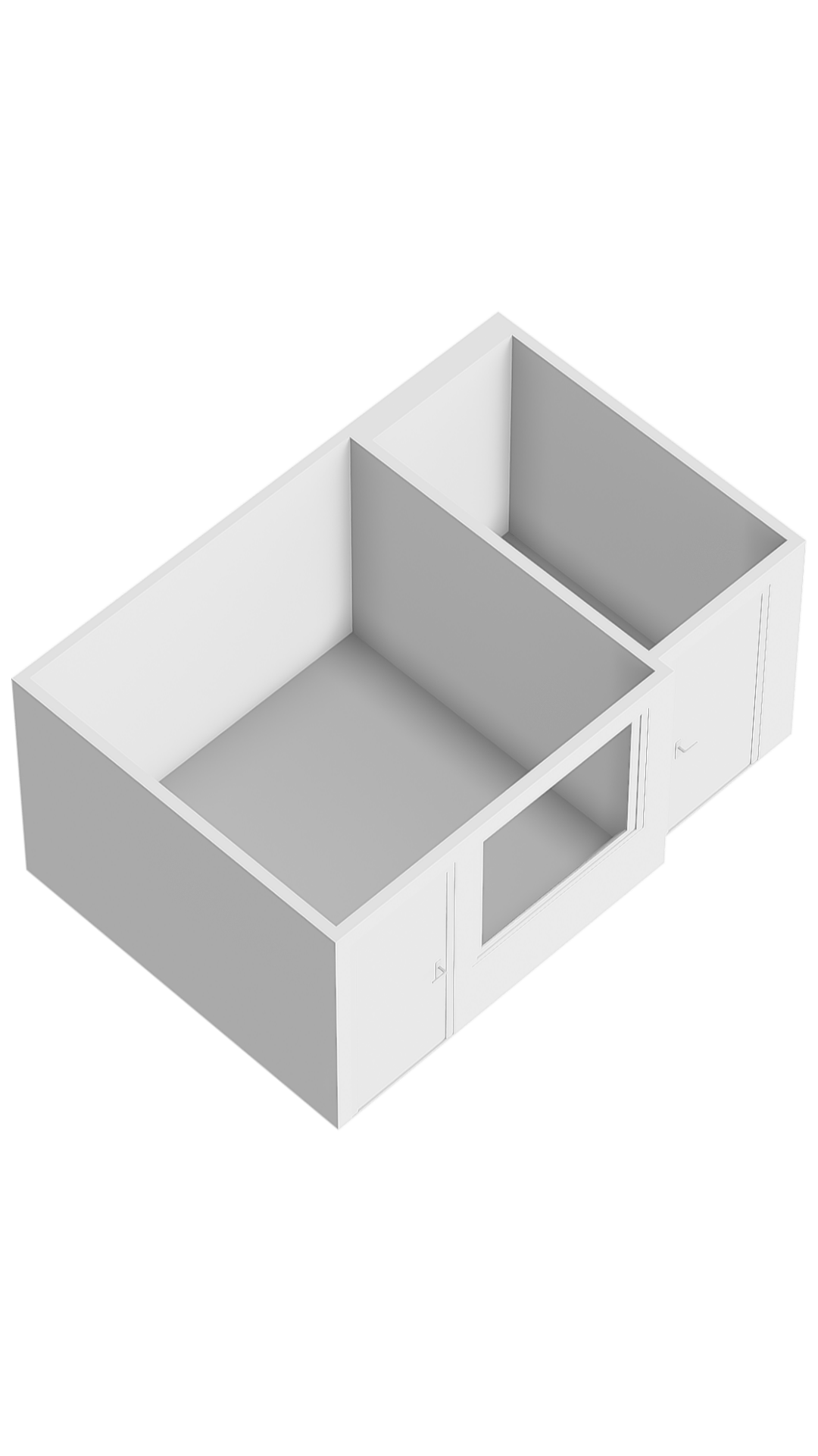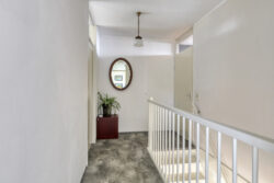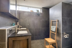 Overloop met toegang tot twee slaapkamers. De slaapkamer aan de voorzijde (ca. 13 m²) beschikt over een Frans balkon en staat via de vide in contact met de woonkamer, wat een ruimtelijk gevoel en vrij uitzicht geeft. De tweede, royale slaapkamer (ca. 17 m²) ligt aan de achterzijde. De moderne badkamer is voorzien van een dubbel wastafelmeubel, inloopdouche en toilet (hangcloset).