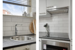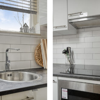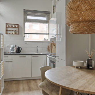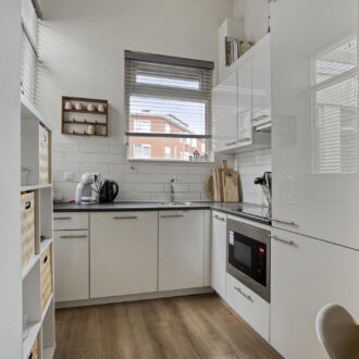 De luxe open keuken is uitgevoerd in een L-vormige opstelling met lichte kasten en lades, een donker aanrechtblad en diverse inbouwapparatuur, waaronder een 4-pits inductiekookplaat, koel-/vriescombinatie, oven-magnetron, vaatwasser en spoelbak met mengkraan. Hier bevindt zich tevens de opstelplaats van de HR cv-ketel (Intergas, 2020).