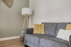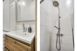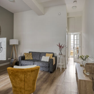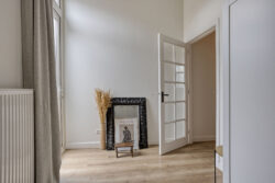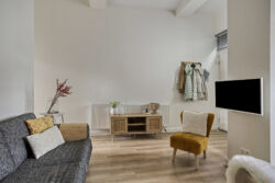 Gesloten entree op straatniveau met gezamenlijke ontvangsthal en toegang tot het appartement. De industriële living beschikt over hoge plafonds van circa 3,40 meter, strak gestuukte wanden, een fraaie laminaatvloer en een netjes weggewerkte meterkast (6 groepen).