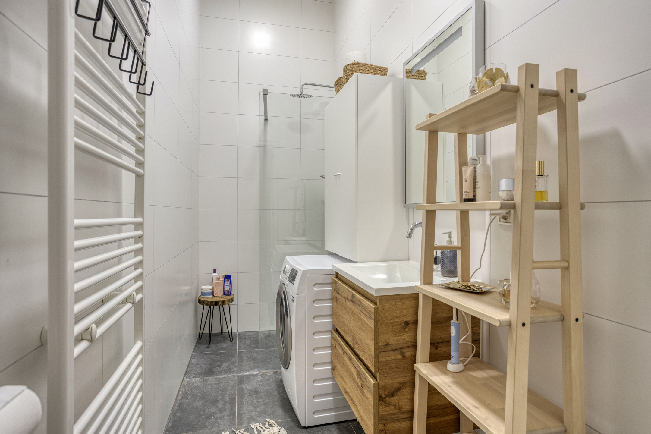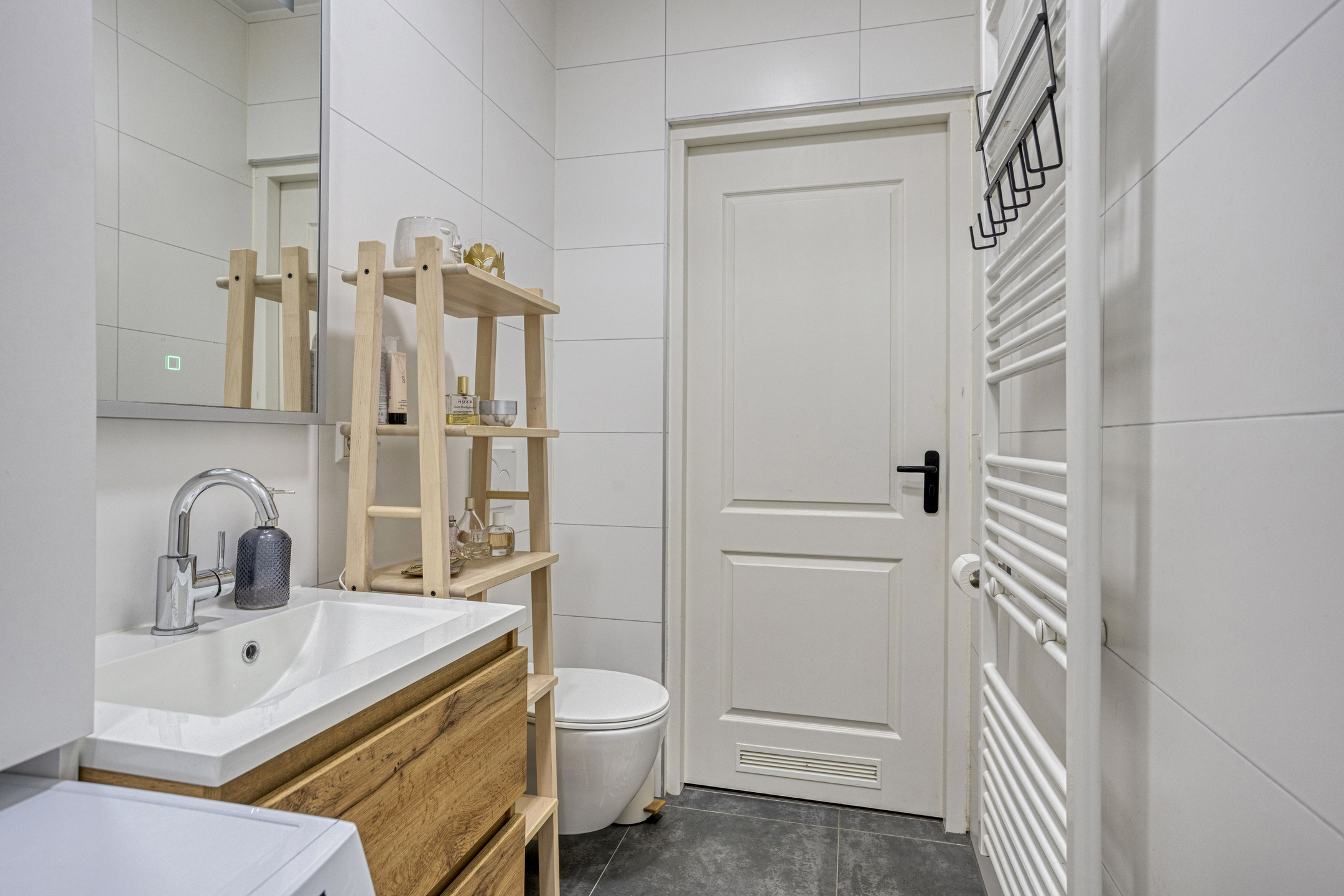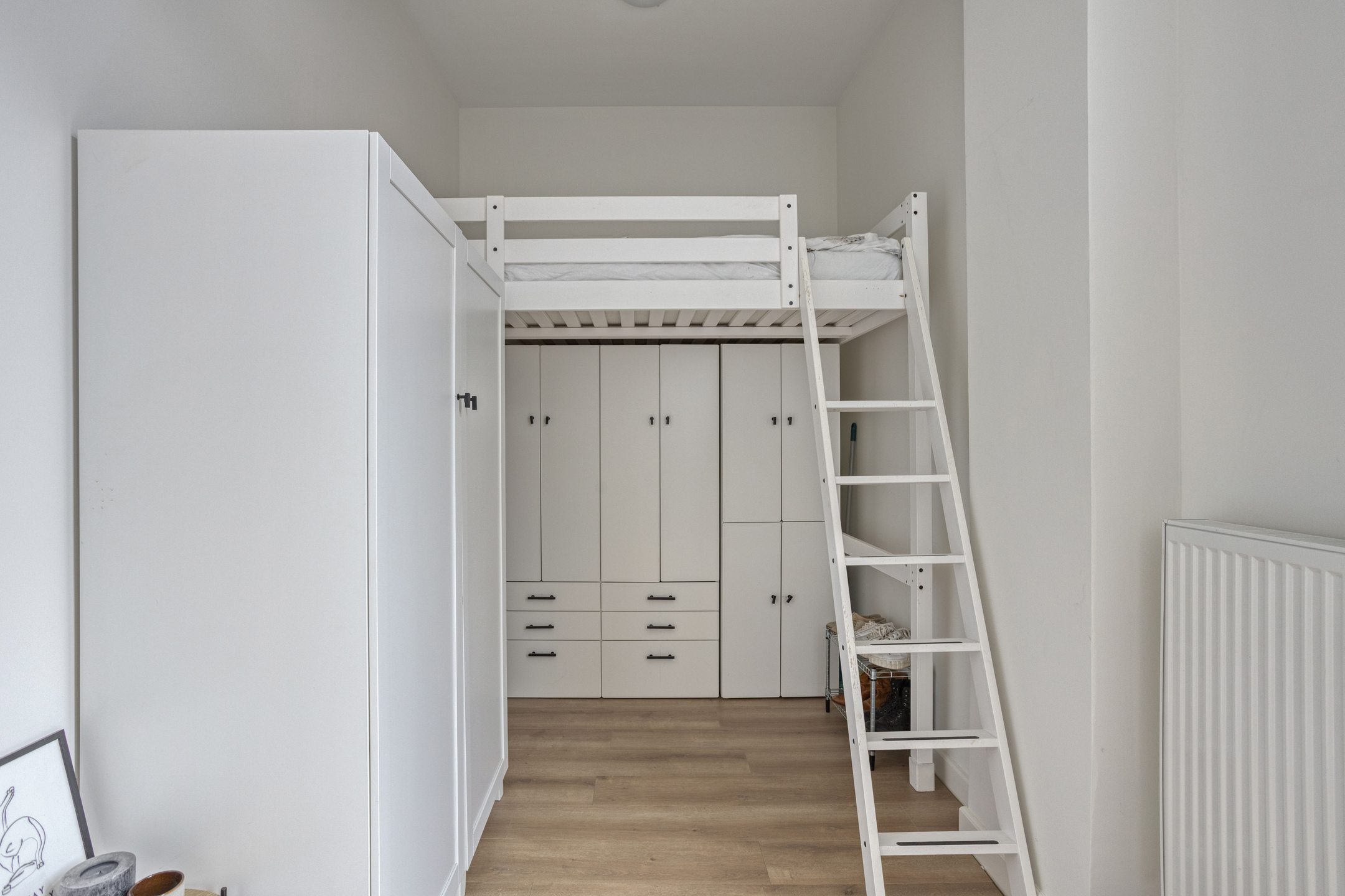 De ruime slaapkamer is gesitueerd aan de achterzijde van de woning. De luxe badkamer is royaal van opzet en afgewerkt met modieuze wand- en vloertegels. Deze is voorzien van een ruime inloopdouche met hand- en stortdouche, een wastafelmeubel met mengkraan en spiegelwand, een zwevend toilet en een designradiator.